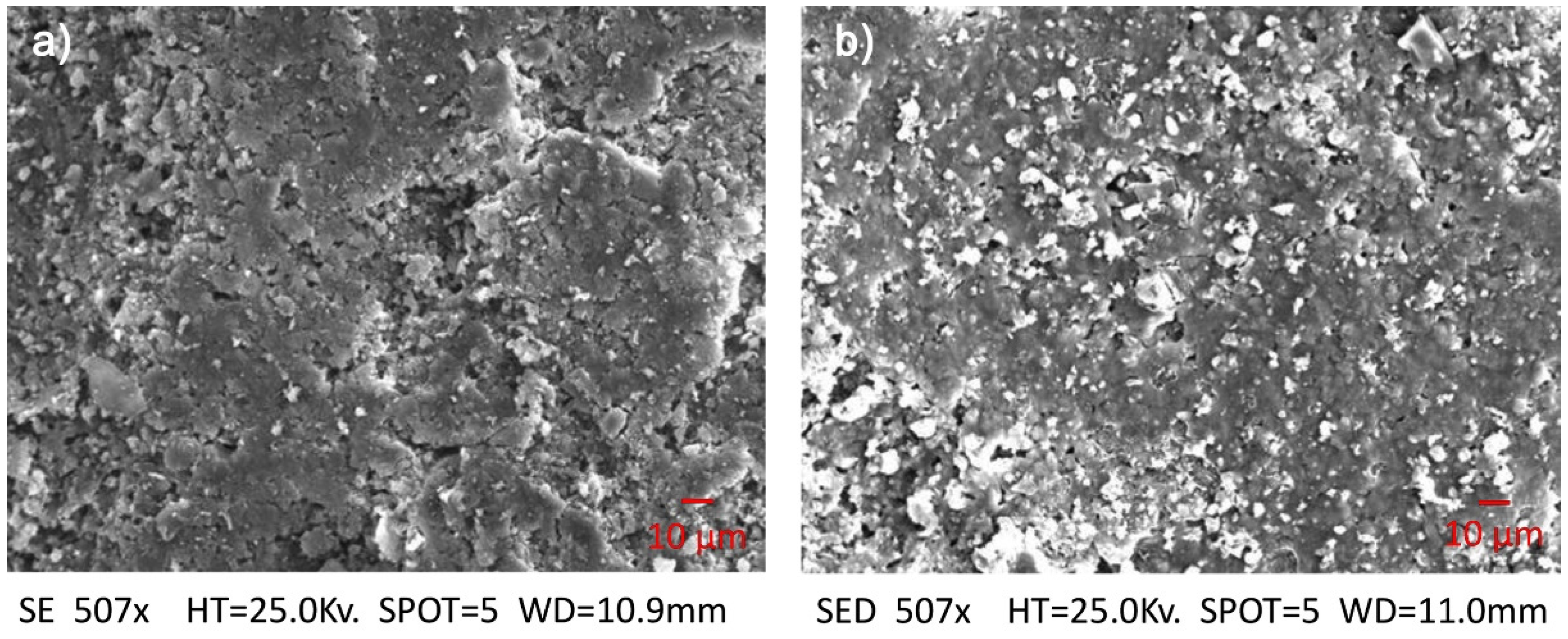 SEM observation of untreated (a) and treated brick specimens (b). White spots represent TiO2 crystals.