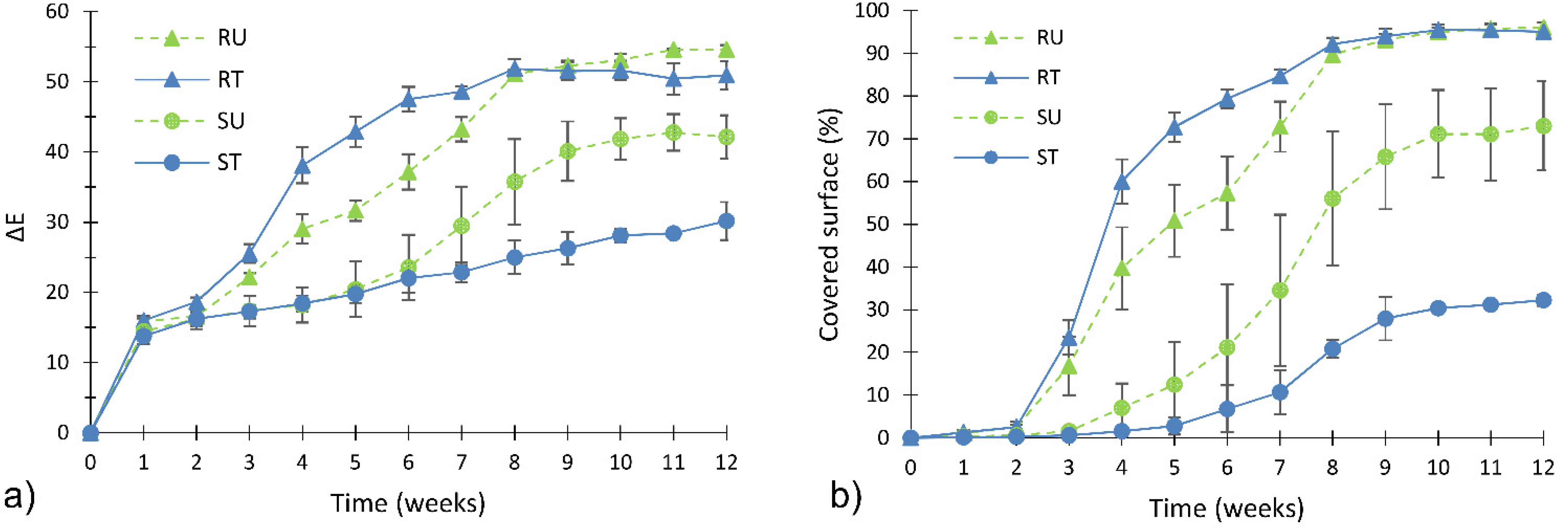 The effect of TiO2 treatment was studied by comparing the RU-RT curve and the SU-ST curve. Figure 5b shows that the trend of treated smooth specimens’ ST is always lower than trend of untreated smooth specimens’ SU. In detail, the application of TiO2 nanoparticles allowed a reduction of algal coverage of about 40% (SU-ST) at the end of the accelerated biofouling test.