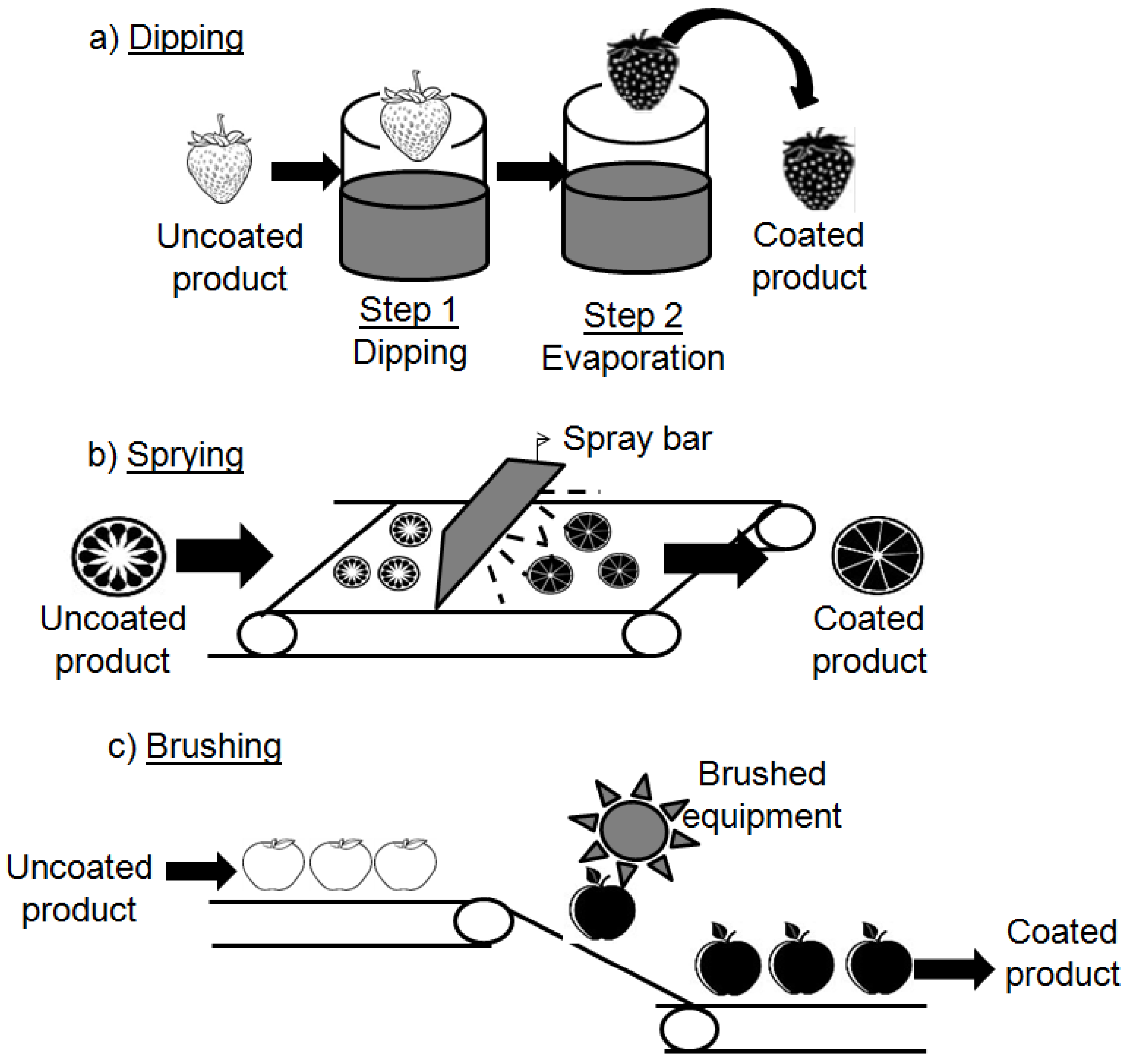 However, when the coating solution is not highly viscous, spraying can be used (Figure 2b). The food product is introduced into the coating system and it is sprayed by controlling the final drop size of the spray solution, which depends on the thickness of the spray gun, nozzle temperature, air and liquid flow rates, humidity of incoming air and polymer solution, drying time and temperature [18]. The usual spraying instrument in this application can produce fine sprays, with drop-size distributions up to 20 μm. Finally, the brushing method is used in some products, such as fresh beans and strawberries, when the reduction of the moisture loss is an issue (Figure 2c). Thin coatings onto the surface of the product are obtained in all cases and they could act as semi-permeable membranes reducing gas transfer rates and creating new packaging materials to extend food shelf-life.