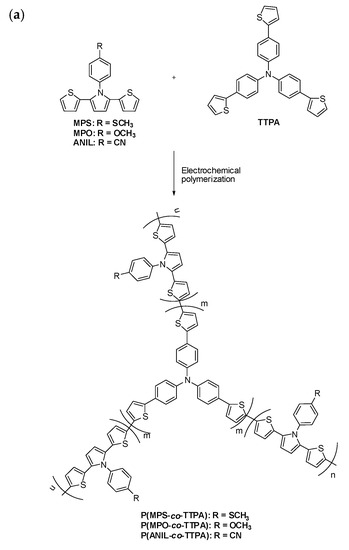 As presented in Figure 2, the Eonset of TTPA, MPS, MPO, ANIL, TTPA + MPS, TTPA + MPO, and TTPA + ANIL are 0.79, 0.70, 0.69, 0.81, 0.72, 0.70, and 0.78 V, respectively. The onset potential disparities of TTPA vs. MPS, TTPA vs. MPO, and TTPA vs. ANIL are less than 0.1 V, indicating the feasibility of copolymerization using TTPA and dithienylpyrrole monomers [24]. The onset oxidation potential of P(ANIL-co-TTPA) is greater than those of P(MPS-co-TTPA) and P(MPO-co-TTPA); this can be attributed to an electron-donating methylthio substituent in a MPS unit and an electron-donating methyloxy substituent in a MPO unit decreasing the onset oxidation potential with respect to that of a cyano-containing ANIL unit. The oxidation peaks of PTTPA, PMPS, PMPO, PANIL, P(MPS-co-TTPA), P(MPO-co-TTPA), and P(ANIL-co-TTPA) films were 1.16, 0.95, 0.9, 1.0, 1.12, 1.21, and 1.19 V, respectively, whereas the reduction peaks of PTTPA, PMPS, PMPO, PANIL, P(MPS-co-TTPA), P(MPO-co-TTPA), and P(ANIL-co-TTPA) films were 0.66, 0.5, 0.55, 0.6, 0.34, 0.21, and 0.22 V, respectively, as shown in Table 1. The wave shapes and redox peaks of cyclic voltammograms (CVs) observed for P(MPS-co-TTPA), P(MPO-co-TTPA), and P(ANIL-co-TTPA) films are different to those of PTTPA, PMPS, PMPO, and PANIL films, proving the formation of P(MPS-co-TTPA), P(MPO-co-TTPA), and P(ANIL-co-TTPA) films. The electrosynthetic schemes of P(MPS-co-TTPA) are presented in Figure 3.