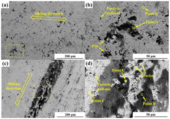 After dry sliding against Al2O3 ball at different temperatures, the worn surfaces of the HVOF-sprayed WC-CoCr coatings and Cr12MoV cold work die steel were investigated by SEM, ESEM and EDS in order to determine the predominant wear mechanism. Figure 5 presents the SEM images of the worn surfaces of the coatings after 30 min sliding with a load of 50 N and a sliding speed of 0.9 m·s−1. An examination of the elemental content of non-rubbed surface and different regions of wear scars by the EDS analysis is shown in Table 2. From Figure 5a,b, it can be seen that the worn surface of the coating at RT exhibited relatively smooth characteristics with extrusion deformation sparsely distributed on it. Additionally, small amount of pits and carbide pull-out were detected, demonstrating that severe plastic deformation took place at the carbide–binder interface and cracks initiated at the defects under friction stress. Furthermore, Co, W and O were the primary elements according to the EDS analysis (wt.%) of point A, which suggests a possible formation of oxides. As the test temperature increased to 200 °C, severe wear traces with oxidized clusters could be seen spreading over the worn surface (Figure 5c) as could cracks, carbide pull-out, and adhesion between the coating and the Al2O3 ceramic (Figure 5d). The EDS results of point B illustrate a high weight percentage of W and O, confirming that a greater number of oxides were identified on the dark clusters as compared to that at RT. The EDS results of point C demonstrate that W, Al and O appeared on the white debris, although the quantities of the white debris were tiny. The existence of Al content confirms that the adhesive wear phenomenon was formed during the sliding process at 200 °C. The majority of the worn surface of the coating at 500 °C was covered by oxide wear debris and tribo-oxidation film (Figure 5e), which is verified by the EDS analysis of point D in Figure 5f and is consistent with previous studies [43]. The EDS spectrum of point D reveals that the dark grey materials primarily contained Co, W and O. During sliding wear at 500 °C, tribo-oxidation film may have broken up and led to the oxidation of the wear debris when it reached the critical thickness. In addition, wear tracks exhibited cracks and carbide pull-out, along with some regions of fatigue delamination. It is suggested that tribo-oxidation and fatigue wear contributed to the dominant wear mechanism of the coating at 500 °C, resulting in the higher wear rate. As shown in Figure 5 and Table 2, there were light gray areas (labeled as points E, F, and G) on worn surfaces at all test temperatures, and the regions in light gray tone mainly contained W and Co along with the presence of O. Compared with the non-rubbed surface, the content of O on the light gray areas was significantly increased, confirming that slight oxidation occurred along with wear track during sliding wear at all test temperatures, particularly at 500 °C. Moreover, the content of oxygen on the surface rubbed at 200 °C (positions B and C) was higher than those on the surface rubbed at 500 °C (positions D and G), which may have been due to the appearance of adhesive wear as a result of adhesion between the coating and the Al2O3 ceramic.