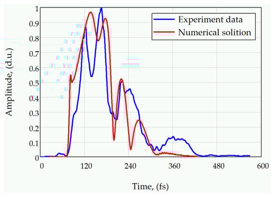 A comparison of the pulses’ forms calculated by our method (red line) and experiment data from [,,,,,,,] is shown in Figure 1.