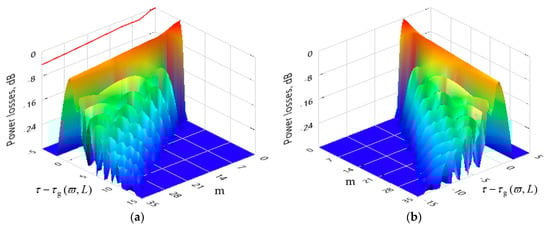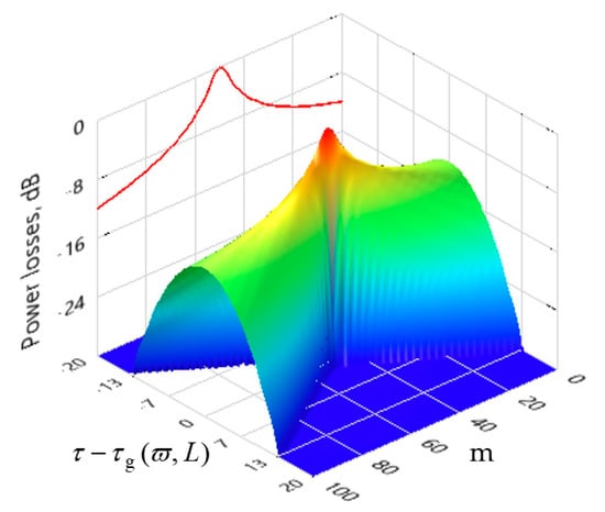 According to Equation (23), the pulse characteristic of the channel is a chirplet by fast time τ, that is second-order dispersion leads to chirping of impulse characteristic. The rate of the frequency changing in the chirplet is positive for normal dispersion and negative for anomalous dispersion.