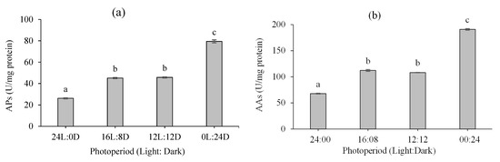 Effect of different photoperiods on digestive enzyme activity of B. orientalis at the end of the experimental period (mean ± SD, n = 3): (a) alkaline protease (AP), (b) alpha-amylase (AA), (c) lipase (LP), and (d) soluble protein content (SPC). Different superscript letters denote statistically significant differences at p < 0.05.