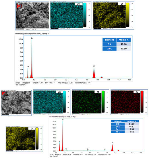 Figure 1a–d show the surface morphologies and the elemental mapping of different samples. The SEM morphologies were presented under the same magnification. The morphology of pure ZnO consists of irregular nanoparticles. The morphology evolution of ZnO due to Ce and Yb dopants maintains the non-uniformity of the prepared nanopowders. To inspect the elemental composition, the samples were assessed by energy dispersive spectroscopy (EDS) attached with SEM. The typical EDS spectrum as well as the elemental compositions of the pure ZnO sample (Figure 2a) shows that the sample is composed of two major elements, namely Zn, and O, while that of doped Yb and Ce ZnO (Figure 2b–d) confirms the presence of Ce and Yb in addition to the above-mentioned elements (Zn, O).