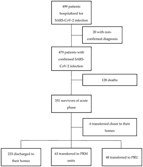 A total of 499 patients were admitted during the study period, of whom 479 had confirmed SARS-CoV-2 infection. Among these, 128 (26.7%) died in hospital. Among the 351 survivors, 223 (63.5%) were discharged to their homes, 111 (31.6%) were referred to post-acute units (63 (17.9%) to PRM units and 48 (13.7%) to PRU), 6 (1.7%) were transferred to a facility closer to their home, and the discharge destination was missing for 1 patient. The flowchart of the study population is shown in Figure 1.