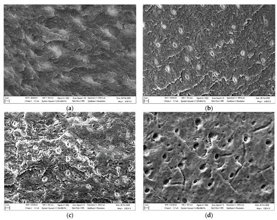 SEM images in Figure 2a–g obtained at the same magnification (×5000) illustrate changes in the progressively demineralized surfaces of individual HTT scaffolds (grains) as a function of the solution used and exposure time. Demineralization treatment of HTT exposed ADDM and its organic components. The least exposed surface corresponds to the reference (Natural) sample (Figure 2a). In Figure 2b–f, the gradually decreasing detrital deposits and the progressive demineralization of the surface can be seen. Figure 2b,c shows only the absence of detritus. Figure 2d–f shows gradual exposure of organic matrix with visible dentin tubules after application of demineralization solutions. The most exposed surface was obtained in the sample treated with 0.6 N HCl for 5 min (Figure 2g). Its surface was clean, no detritus was present, wide open tubular holes were visible after treatment, and the organic matrix was completely exposed.