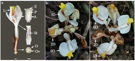 The floral structure of W. villosa var. villosa (a) and its morphological changes from 0 to 2 DAA on sunny (b) or rainy (c) days. A = anther, D or DAA = days after anthesis, L = lip, O = ovary, Ov = ovule, P = pollen, S = stigma, St = style; Scale bar = 2 mm.
