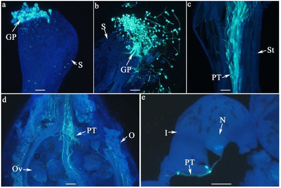 Pollen–pistil interaction in W. villosa var. villosa, as illustrated by fluorescence emission microscopy. A general overview of pollen adhesion and germination on the inner surface of the funnel-shaped stigma following pollination (a), pollen grains within the stigma are dispersed upon crushing the stigma (b), the pollen tube elongates along the stylar canal (c), penetrates the ovary (d), and ultimately reaches the ovule (e); GP = germinated pollen, I = integument, N = nucellus, O = ovary, Ov = ovule, PT = pollen tubes, S = stigma, St = style; Scale bar = 100 µm.