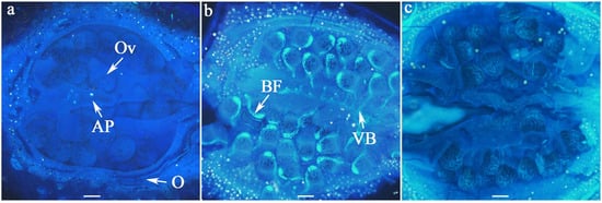 Fluorescence indicating non-viable ovules in longitudinal sections of ovaries at different days after anthesis (DAA). No bright fluorescence was observed on the ovules at 2 DAA (a). By 5 DAA (b), fluorescence became visible along the vascular bundles of the ovules, but it disappeared by 8 DAA (c); AP = axile placentation, BF = bright fluorescence, O = ovary, Ov = ovule, VB = vascular bundle; Scale bar = 100 µm.