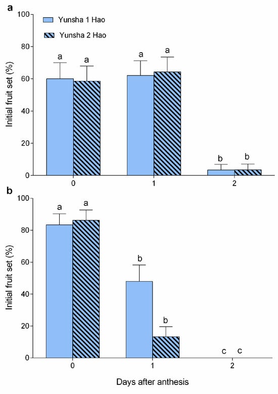Initial fruit set (%) after pollination at 0–2 days after anthesis (DAA) in either cultivar in 2022 (a) and 2023 (b). Error bars indicate SE. Different lowercase letters above the error bars indicate significant differences (p < 0.05) in IFS among the different pollination dates (presented as DAA) for each cultivar.