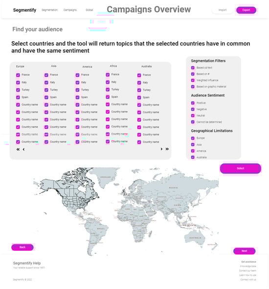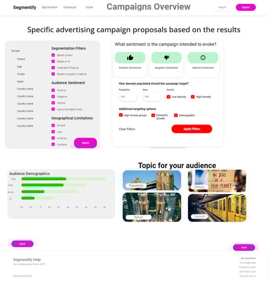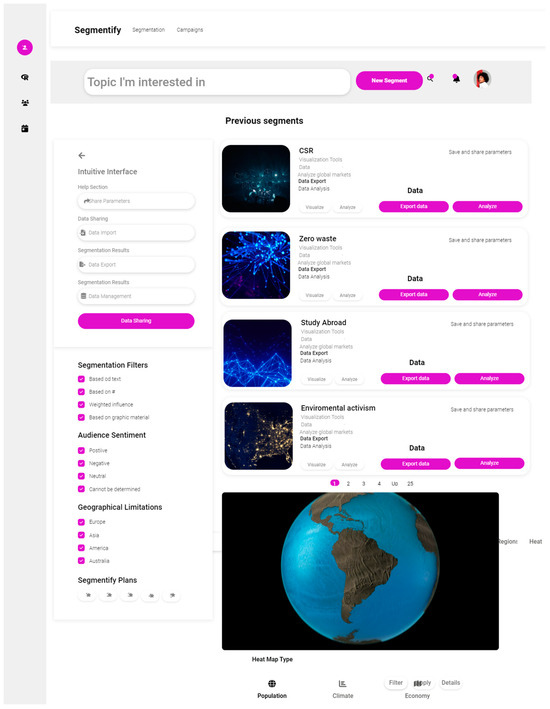 The final phase is the testing of the prototype—it follows the complete development of the software. The testing phase is crucial as it allows for the refinement and evolution of ideas, narrowing down the problem space []. We will evaluate its effectiveness and how well it meets user requirements. This includes collecting and analyzing feedback from potential users and adjusting our solution based on this information. The Prototype phase [] has to lead to the evaluation, adjustment, and replay of prototypes to inform decision-making based on successive iterations or versions. The output of this process should be powerful and user-friendly software for dynamic segmentation, bringing significant benefits to the fields of global advertising planning and strategic management.