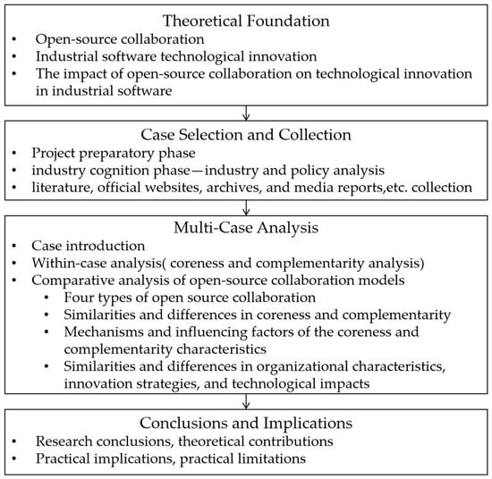 This study adopts a multiple case study approach, selecting four different industrial software collaboration cases as research subjects to explore how various open-source collaboration models impact technological innovation of Industrial Software Industry. The primary goal is to provide theoretical insights and practical guidance for strategic collaboration in industrial software and, more broadly, in the information industry. The choice of the multiple case study method is based on several considerations. First, existing research on this topic lacks systematic and comprehensive theoretical exploration, and the inductive reasoning of case study methodology can bridge this research gap through in-depth description and analysis of cases []. In the intersection of technological innovation and open-source collaboration, although scholars have explored collaboration models in open-source communities [] and the evolution mechanisms of open-source software ecosystems [], there is still a lack of detailed case analysis regarding the specific mechanisms of industrial software collaboration models in technological innovation management systems. Therefore, the case study approach helps deepen the understanding of this topic at the theoretical construction level. Second, the research questions of this paper aim to explore how different open-source collaboration models specifically function, which involves unpacking the “conceptual black box” of open-source collaboration and revealing the operational mechanisms of different collaboration models. Case study methodology has unique advantages in identifying complex collaboration model characteristics and analyzing their underlying mechanisms []. Finally, the multiple case study method has a strong replication logic, which allows for the development of robust and generalizable theoretical propositions through within-case analysis and cross-case comparison. In technological innovation management research, multiple case study methods have been widely used to explore business collaboration models [], innovation paths [], and technology evolution []. By synthesizing and comparing different cases, this method can effectively extract common patterns, thus forming a theoretical framework that provides better explanatory power for real-world situations. To provide a more intuitive understanding of the study’s structure, Figure 1 presents the overall research framework, which integrates theoretical foundation, case selection and collection, multi-case analysis, and research contributions.