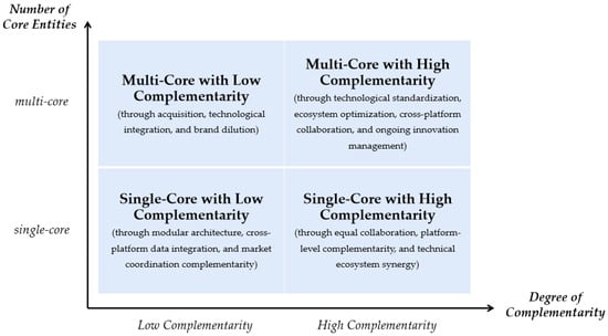 Based on the characteristics of the four cases analyzed above, this study further decouples the open-source collaboration models into four distinct types: single-core with high complementarity, single-core with low complementarity, multi-core with high complementarity, and multi-core with low complementarity. This decoupling is based on two dimensions: the degree of complementarity in open-source collaboration (high complementarity/low complementarity) and the number of core entities (single-core/multi-core), as shown in Figure 2. The analysis and summary of how these four open-source collaboration models impact the technological innovation management systems of industrial software companies are as follows.
