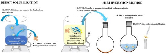 Bisabolol-loaded micellar solutions were prepared at a constant Poloxamer concentration of 5% and varying concentrations of the active substance—0.5%, 1.0%, and 1.5%. The techniques of direct solubilization and solubilization by the film-hydration method were applied (Figure 1).