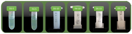 Samples DS-5, FH-5, and FH-10 showed a sustainable appearance over 30 days of storage under standard conditions and after centrifugation for accelerated stability testing. Creaming was observed in samples DS-10, DS-15, and FH-15 after centrifugation and after the second day of storage under standard conditions (Figure 3). All affected samples were easily resuspended after gentle shaking, and the original appearance was completely recovered.