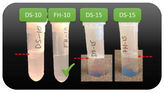 Centrifugation-induced creaming (pointed out with red arrows) by samples DS-10, DS-15, and FH-15, and stability (no creaming) by sample FH-10.