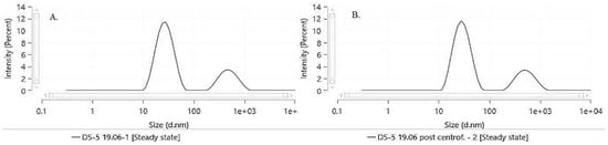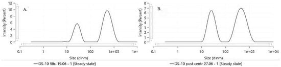 Size distribution by intensity of DS-10 (A) before and (B) after the accelerated stability test.