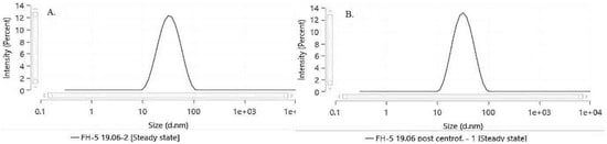 Size distribution by intensity of FH-5 (A) before and (B) after the accelerated stability test.