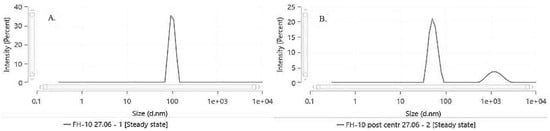 Size distribution by intensity of FH-10 (A) before and (B) after the accelerated stability test.