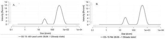 Size distribution by intensity of DS-15 (A) before and (B) after the accelerated stability test.