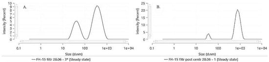 At the highest alpha-bisabolol concentration of 1.5%, both solubilization methods demonstrated an increase in the mean hydrodynamic size and polydispersity, as well as notable differences in the dispersion characteristics before and after centrifugation and resuspension. Figure 8 and Figure 9 illustrate the particle size distribution of samples DS-15 and FH-15 before and after performing the accelerated stability test by centrifugation followed by a subsequent resuspension.