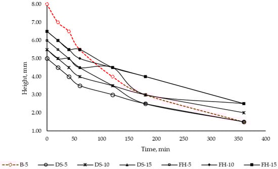 A foamability test was conducted to evaluate the washing potential of the bisabolol-loaded micellar solutions in comparison to free micellar water. The ability to form a foam is well known to be closely related to the presence of surfactants and the cleansing properties of the product []. Under the chosen experimental conditions, all test samples demonstrated the formation of a stable foam persisting for at least 6 h. The presence of solubilized alpha-bisabolol was shown to slightly reduce the initial height of the foam but stabilize it over time. The latter effect became more evident as the concentration of bisabolol increased (Figure 10).