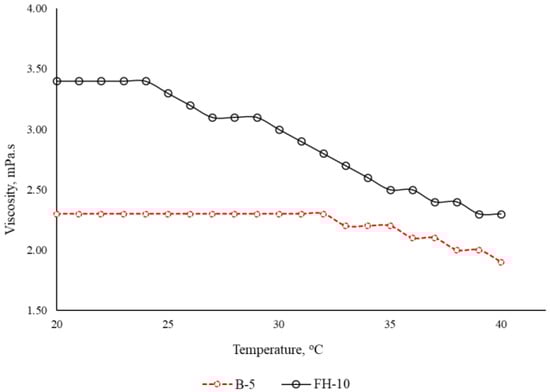 Temperature–viscosity curves of the reference Poloxamer 5% solution (B-5) and the optimized bisabolol-loaded sample FH-10.