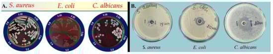 In addition, the cup-plate technique was applied to evaluate the inhibition zones of alpha-bisabolol. For this purpose, dense seeding of all microbial strains was carried out on Muller–Hinton agar. By using a sterile cork-borer, a cylindrical hole with a diameter of 7 mm was drilled in the center of each Petri dish, into which 100 μL of the test sample was placed. The Petri dishes were left for aerobic cultivation under the standard conditions for each strain: 24 h at 37 °C for E. coli and S. aureus and 48 h at 35 °C for C. albicans. Thereafter, the diameter of the manifested zones of inhibition was measured.