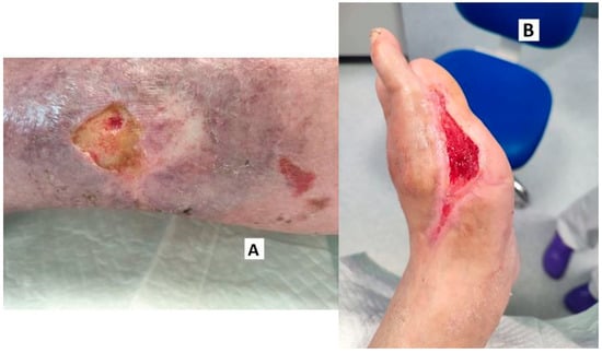 Many factors cause the process to be delayed, which impedes it and makes it chronic in the first place. Based on probability, 1406 clinical presentations may occur [,,,,,], with 140 pathologies thought to be involved and an average comorbidity of approximately six for people over 65 (85% of the population having at least one chronic illness and 30% having three or more chronic conditions). The main causes of CWs include venous ulcers (VUs), diabetic ulcers (DUs) and pressure ulcers (PUs), all of them influenced by systemic factors such as metabolic, hormonal, venous circulation, or disability [,,,]. The typical clinical aspect of a venous ulcer and a diabetic foot ulcer is displayed on Figure 1A and 1B, respectively.