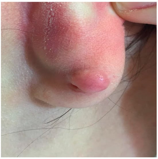Around 11 million cases of keloids, a pathological condition with distinct clinical symptoms, are reported annually in wealthy countries []. Around 70% of cases occur in younger groups []. Clinically, keloid scars appear as hard, rough papules and plaques with an uneven surface. They have a wide range of colors, including pigments that are red, purple, and brown. Unlike hypertrophic scars, keloids extend beyond the original wound’s boundaries and do not fade with time []. Because of their disruptive properties, keloids often cause symptoms like pruritus, pain, and discomfort. These symptoms can appear months or years after the initial damage. People who have keloids frequently experience psychological distress linked to negative self-perception, negative experiences, and body dysmorphic disorder [,]. Figure 2 shows a keloid scar secondary to ear-piercing intervention with the typical, previously described, clinical appearance.