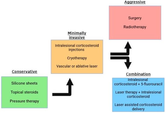 As previously mentioned, keloids frequently require combined therapies of those detailed above in order to obtain satisfactory outcomes. Figure 3 shows a schematic representation of currently available keloid scar treatments, outlining the progression from conservative to aggressive therapies.