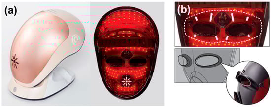 (a) The photograph of the CF Magic Mask equipped with 480 red-to-near-infrared (R/NIR) lights and (b) safety placement and eye-shield design to eliminate direct radiation from the lights to the eyes, with the arrow showing the 3D-rendering image.