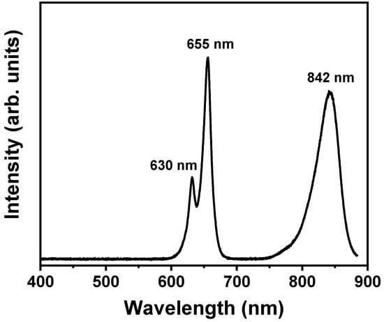 Figure 1a is a photograph of the CF Magic Mask test product that is equipped with 480 red-to-near-infrared (R/NIR) LEDs. To eliminate the risk of direct light radiation through the eyes, a safety guard is implemented with a thick molding mask with a depth of 15 mm and a distance to the nearest LEDs of 20 mm, which completely blocks the light radiation to the eyes, as illustrated in Figure 1b. In detail, the LED groups consist of 144ea 655 nm LEDs, 112ea 630 nm LEDs, and 224ea 842 LEDs with a total rated output of 14.5 W, and the optical spectrum is depicted in Figure 2 and was recorded using a UV–Vis–NIR fiber optic spectroradiometer (USB 4000, Ocean Optics, Orlando, FL, USA).