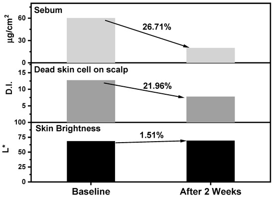 Improvements in skin brightness (L*), dead skin cells on the scalp (D.I.), and skin sebum (µg/cm2) after 2 weeks of the use of the test product.