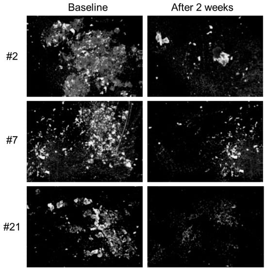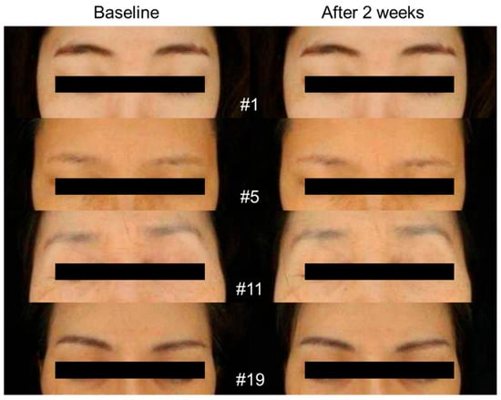 Clinical photographs comparing the skin brightness of the participants at baseline and after 2 weeks of treatment, black shape is used to protect patient privacy.
