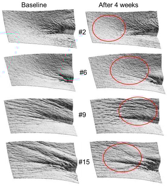 We initiated the evaluation by addressing the safety aspect of the CF Magic Mask product. Given that exposure to high doses of near-infrared (NIR) light spectroscopy directly targeted at the eyes can cause injury [,], implementing a protective shield is imperative in ensuring eye safety. As illustrated in Figure 1b, the CF Magic Mask design features a safety guard crafted from molded silicone to shield against direct radiation from red-to-near-infrared (R/NIR) LEDs. Additionally, there is a deliberate exclusion zone of approximately 1.5 cm around the eyes that is not covered by the LEDs, contributing to the smart and secure design of the device. Consequently, there were no adverse effects observed among the subjects after undergoing four weeks of treatment with the product.