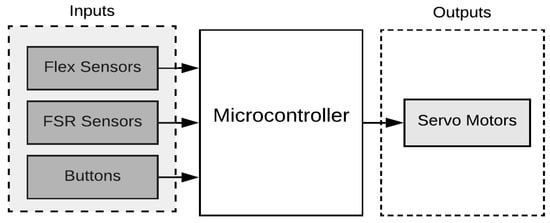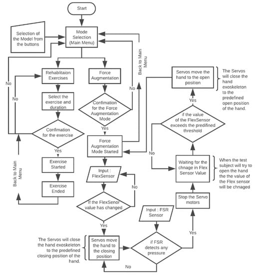 The programming was carried out on AT Mega 2560. The flow chart for the control algorithm is given in Figure 14. The program starts with waiting for the user input for the selection of the mode. There are two modes programmed: force augmentation and rehabilitation. When the user selects a mode, confirmation is needed to start that mode. For example, when the force augmentation mode is selected, the program will wait for any increase in the value of the flex sensor. If the value has increased, the servo motors will start to close the hand exoskeleton and move until the preprogramed closing position. Meanwhile, the hand is closing. The FSR sensor placed at the tip of each finger detects if there is any object grasped by the user. If FSR detects any force feedback due to the wearer picking up an object, the servo motors will stop and wait for the user to open their hand. This mode stays in the loop until the user decides to end the mode or turn off the exoskeleton.