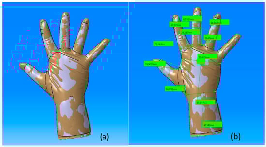 Solid model of the 3D-scanned hand. (a) Solid Model, (b) Solid Model with Dimensions.