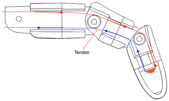 In this section, the design of the hand and elbow exoskeleton is elucidated. The actuating mechanism selected was the tendon flexion mechanism as it removes the weight from the limb of the patient, providing comfort. Artificial tendons are elastic components that can store and transmit energy over the joints of humans. To minimize the mechanical work of human joints, the elastic characteristics of the tendons were optimized. Humans and animals have tendons that serve to improve mobility and provide contact between joints. This mechanism lowers the net joint work. The same tendon flexion mechanism is used to develop a link between finger joints. This tendon mechanism is restoring and increasing the joint force of the patient’s fingers. Furthermore, it is used in the opening and closing of the hand. The tendon flexion mechanism is implemented on the upper limb of the patient wearing the exoskeleton. Tendons are attached to the servo motors and then pass through the forearm, connected to the finger joints of the exoskeleton as, shown in Figure 4. Servo motors are attached to the wearer by a backpack to lower the weight of exoskeleton. Its application provides mobility and creates a link between joints. When the initial force is applied by the patient, the servo starts to move. One side of the tendon is connected to a servo motor and the other end is connected to a finger’s joint. One tendon is labeled blue and the second one is labeled red, as shown in Figure 5. When servo applies force on the blue tendon, it flexes and the hand is opened. Similarly, when force is applied to red tendon, the hand closes or grips the specified object. In this way, it helps in the patient with gripping and rehabilitation exercises.