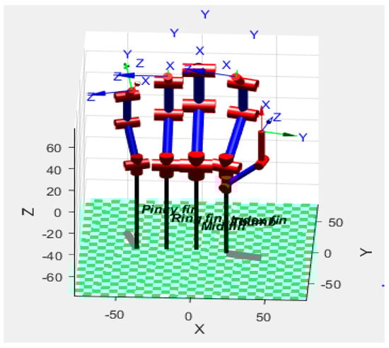The mathematical model was developed in MATLAB and forward kinematics of the model were performed via the Peter Corke robotics tool box on the middle finger, as shown in Figure 5. In this paper, we use the transfer equation of the middle finger because there is only a change in link lengths of the other fingers. In Table 1, DH parameters of the finger are shown and the transformation matrix of the finger is given in Equation (1), which is derived from the DH parameters of the middle finger.