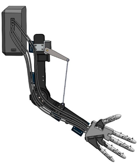 It is a difficult task to fulfill all of the requirements in an exoskeleton system, with the major difficulties being limited space and the trade-off between compactness, positioning accuracy, and weight, as well as the requirement of efficient and easy to maintain actuators. Firstly, the degrees of freedom of the human hand are high and there is very limited space for hardware to be installed. Hence, the actuators of the exoskeleton were placed in a backpack (components box) away from the hand and forearm, so there is no extra weight on the patient’s limb. After many revisions, the CAD model was developed, keeping in mind all the design constraints and improving the final design overall. The design of the exoskeleton is shown in the Figure 8 and Figure 9.