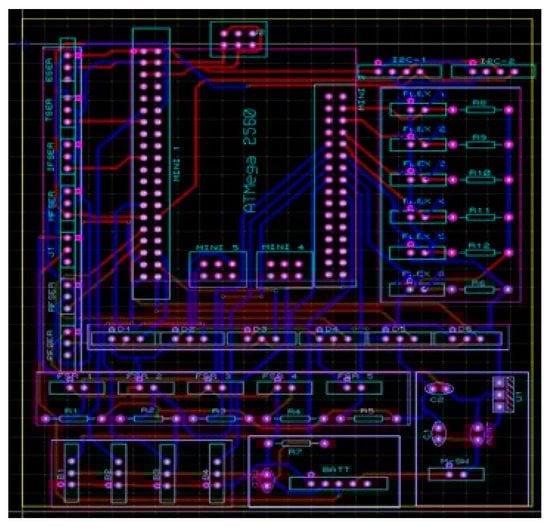 The exoskeleton’s design is divided into two parts, the hand exoskeleton and the arm exoskeleton. The hand exoskeleton is designed for the actuation of fingers; each finger is controlled by a separate servo motor, giving the advantage that each finger is controlled individually by the user. In total, five servo motors were incorporated into the design to control all five fingers of the hand exoskeleton. Ring-like attachments were included so that the user can easily wear the hand exoskeleton. For the actuation of the elbow joint, the arm exoskeleton was designed and only one servo motor is used for the actuation of the elbow joint. In this section, the electrical design of the exoskeleton is explained. The electrical design is divided into three parts. The first part is the microcontroller portion where the circuits were developed to integrate the sensors with the microcontroller. The second part is the battery and power connection, and the last part is the connections for the buttons to operate the exoskeleton. The Mega Pro Mini 2560 microcontroller was used for all the coding and the algorithm implementation. The microcontroller is mounted on top of the PCB, and all the sensors and the actuators are connected via the JST connectors. The PCB design is shown in the Figure 10 and the 3D model of the PCB is depicted in Figure 11. In Figure 10, the blue blocks are the connectors for the actuators, buttons, and sensors.