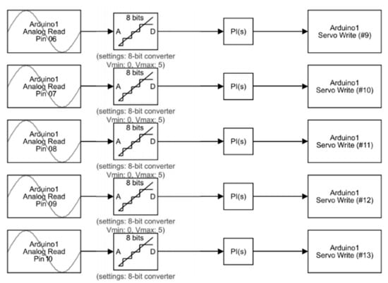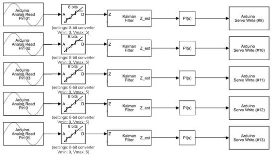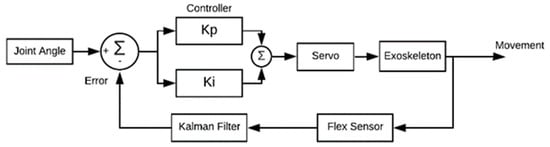 The data is acquired as input from the flex sensor, which is an analog signal. This signal then goes to a digital converter (ADC) analog, which transforms this analog signal into a digital signal. Arduino has an 8-bit ADC, which means 1024 discrete analog levels are detected. In this way, the analog signal coming from 0 to 5 volts is converted into 1024 discrete levels through ADC. This signal goes through the Kalman filter, which removes the noise and filter signal. The sample rate of the Kalman filter is set to 1 s. The Kalman filter is an iterative mathematical method for the rapid calculation of an input’s true value. The data inputs that we received consist of unpredicted random errors and uncertainty that generated a lot of difficulty in obtaining the exact/true value for the method. The Kalman filter helps us to predict and determine values that are very close to the actual value. The control parameters P and I determine the desired output. By setting the gain, we obtain the desired angle of the exoskeleton. The control algorithm of the flex sensors implemented on Mega Pro is shown in Figure 15.