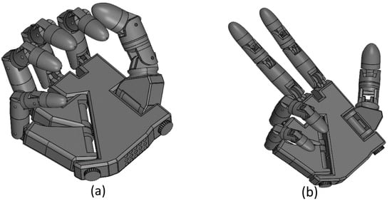 Al Bakri, Anas, et al. [] proposed a training robot that is an electromyography (EMG)-based exoskeleton primarily used for the rehabilitation training of patients who suffered strokes. This robot enabled the use of EMG of the patient’s body to control the opening and closing of the hand. The advantage of this device was that it could fit to any type of hand and fingers. Bian, Hui, et al. [] developed a hybrid exoskeleton named EFW Exo II for rehabilitation of the forearm. The device was based on a parallel 2-URR/RRS mechanism and a serial R mechanism which could fit on both the left and right arm, with an adjustable design for different arm lengths. The main benefit of EFW Exo II was enabling rehabilitation exercises for joints. Sahadev et al. [] reviewed the hand exoskeleton exercises and deduced that an exoskeleton hand can improve the therapy results and also reduce the cost of rehabilitation.
