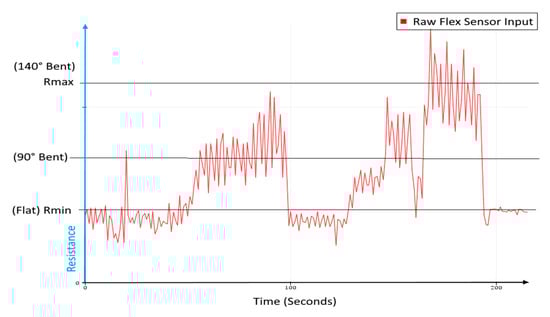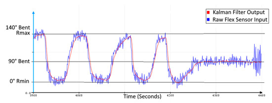 In order to acquire portability advantage of the proposed model of the exoskeleton, it was manufactured using 3D printing. The 3D printing made the exoskeleton cost effective and easy to manufacture. Prior to experiments for motion study on the hardware, the hardware and the algorithm were tested. The input from the flex sensor was non-uniform and quite noisy, so to overcome that problem, the Kalman filter was used. In Figure 19, the raw signal from the flex sensor is shown. The raw signal shows the relationship between the change in resistance and the change in position (bent angle) with time. The raw signal is communicated to the microcontroller. A continuous signal variation due to noise is not acceptable for the control algorithm as it will demand high input energy. Hence, the Kalman filter is used. In Figure 20, the Kalman filter is applied on the raw input from the flex sensor, making it smooth output for the actuation loop for the servo motors. Experiments for hand and elbow joint motion were performed to evaluate the effectiveness of the proposed exoskeleton. In the experiments, the participant was healthy and they were advised to apply little to no movement and force in order to test the capabilities of the exoskeleton for a monoparesis patient.