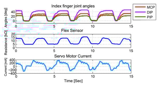 The first experiment was to record the motion of the hand’s fingers in a picking up and placing task. The task includes the procedure of picking up, lifting, holding, and releasing. A bottle of water was used in this experiment. In the experiment, the hand exoskeleton was controlled to follow the movement of the user’s hand with the help of flex sensors providing support and grip to the user’s hand. After getting used to wearing the exoskeleton, the participant was asked to perform the task five times for about 15 s, for a demonstrative example of the test results. The output motion of the index finger is shown along with the flex sensor input in Figure 21. MCP (Meta Carpo Phalangeal), DIP (Distal Inter Phalangeal), and PIP (Proximal Inter Phalangeal) are the three joints of the index finger.