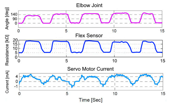 The second experiment was to record the motion of the elbow joint in a flexion and extension task. The task includes the flexion and extension of the elbow joint while wearing the exoskeleton. In the experiment, the forearm exoskeleton was controlled to follow the movement of the user’s elbow joint to provide support and strength. In this experiment, the participant was asked to perform the flexion and extension task five times in 15 s for the demonstration of test results. The output motion of the elbow joint and the flex sensor input is shown in Figure 22.