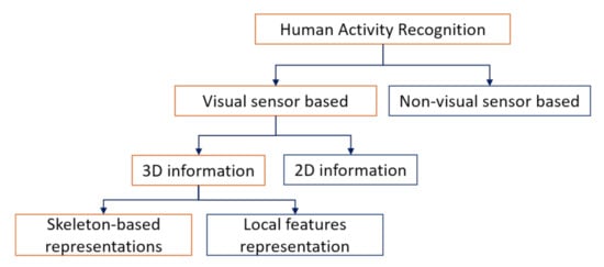 One of the main objectives of HAR is extracting descriptive information (i.e., features) from human activities to be able to distinctly characterise and classify one activity from another. Visual sensor-based approaches are mainly based on 2D or 3D information obtained from the sensor devices. However, it would be extremely difficult to understand and interpret activities using regular visual sensors such as RGB cameras which provide 2D visual information []. These sensors provide limited information for an activity performed in a real-world environment. Recently, most research on HAR based on visual sensors has employed RGB-D sensors, which have proven to be better devices for observing human activities [,,,]. These RGB-D sensors provide a means of better observing the world to detect human poses used to build HAR systems []. They provide a platform for exploiting depth maps and body shape, and detecting skeletal joints of humans in 3D space which are used in developing sophisticated recognition algorithms. Furthermore, among the many approaches to human representation based on 3D information [,,,], the majority of the existing methods can be generally grouped into local feature-based representations [] and skeleton-based representations [,,].