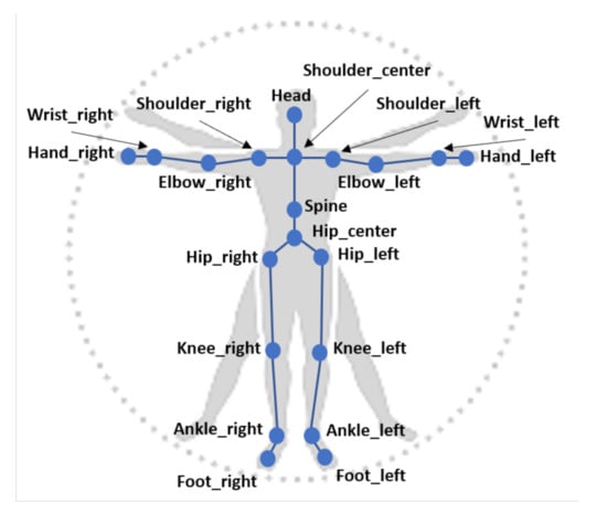 Direct methods of acquisition of 3D skeletal data of human activities are carried out using different devices that are commercially available, which include MoCap systems [], structured-light cameras and time-of-flight sensors. These devices detect the kinematics of human body models in order to identify the relevant joints in the body. Figure 3 shows a representation of tracked skeletal joints obtained from a Microsoft Kinect v2 RGB-D sensor [].